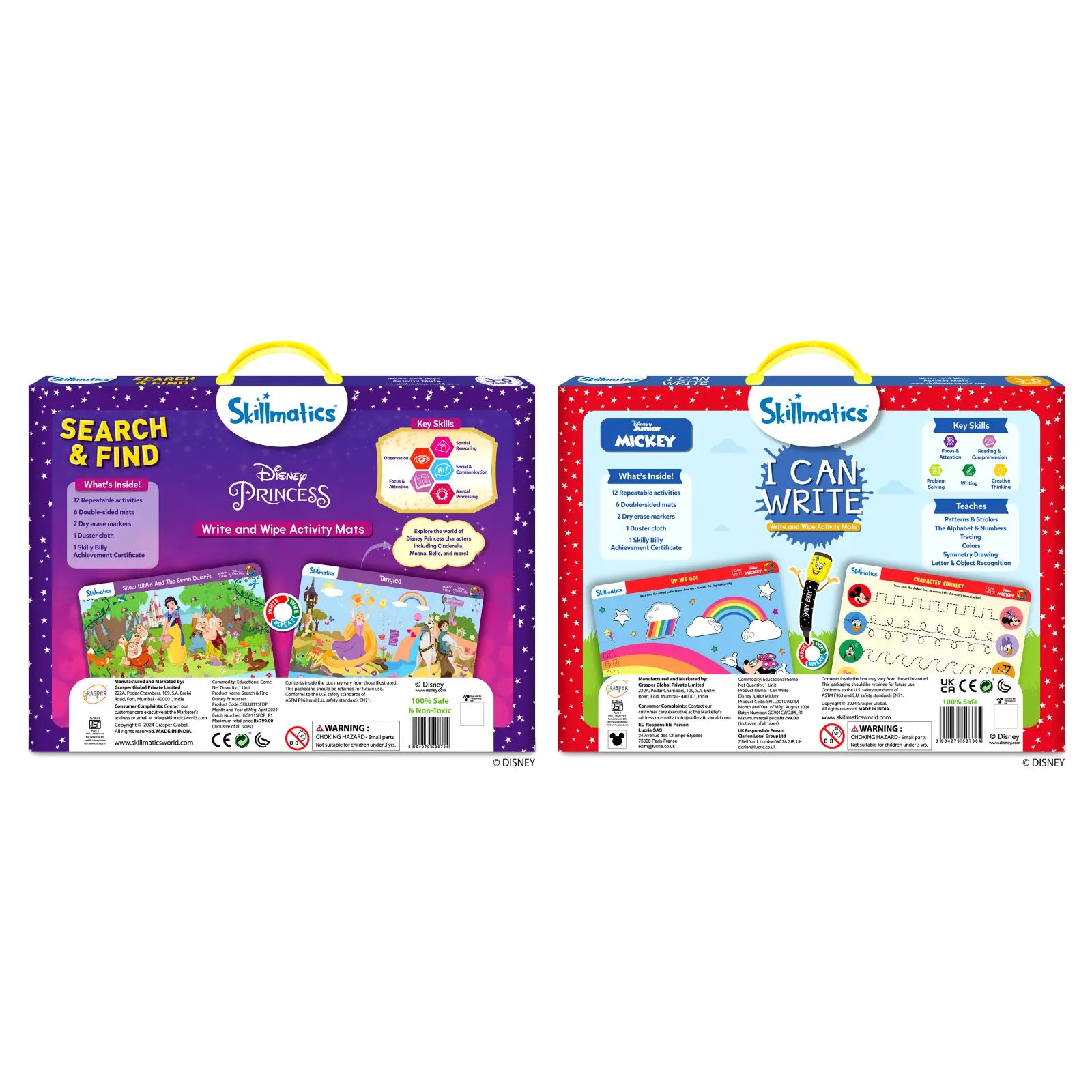 Two Skillmatics educational kits for children Disney Princess and Mickey Mouse themed with write and wipe mats