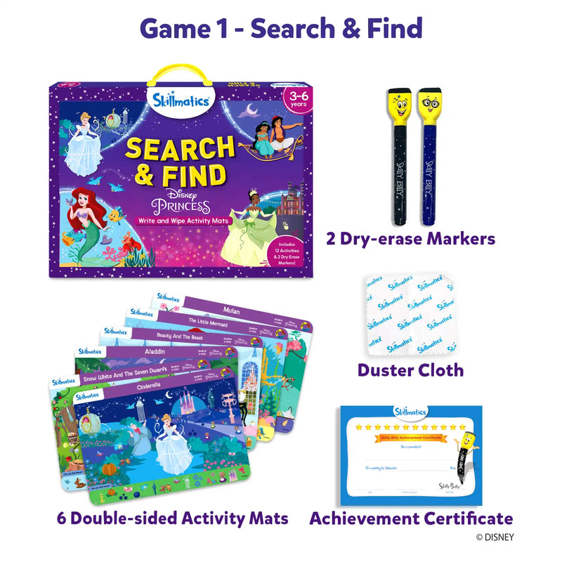 Disney Princess-themed Search & Find Skillmatics game for ages 3-6 with activity mats and markers