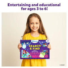 Young girl holding Disney Princess Search & Find Write and Wipe activity book for ages 3-6