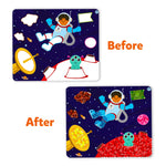 Children’s space-themed puzzle set with astronaut and alien before and after coloring