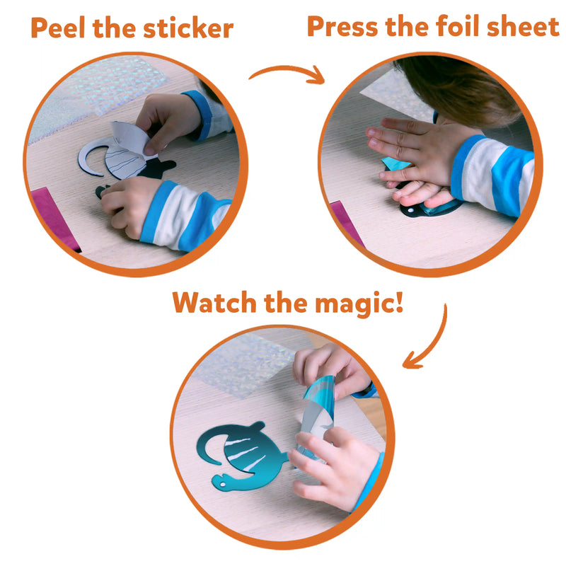 Select a picture canvas, apply sparkly foil sheets using the included stickers, and watch the picture come to life!