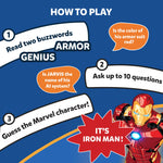 Instructions for Marvel-themed Guess in 10 Trivia Card Game for ages 8+