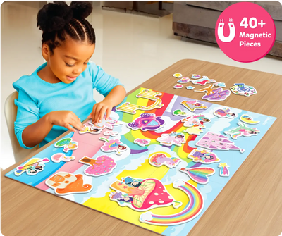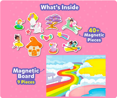 Embark on a creative journey with the world of Magnetopia! Your child can design their own Princess and Unicorn Land with over 40 enchanting magnetic pieces and enjoy hours of pretend play!