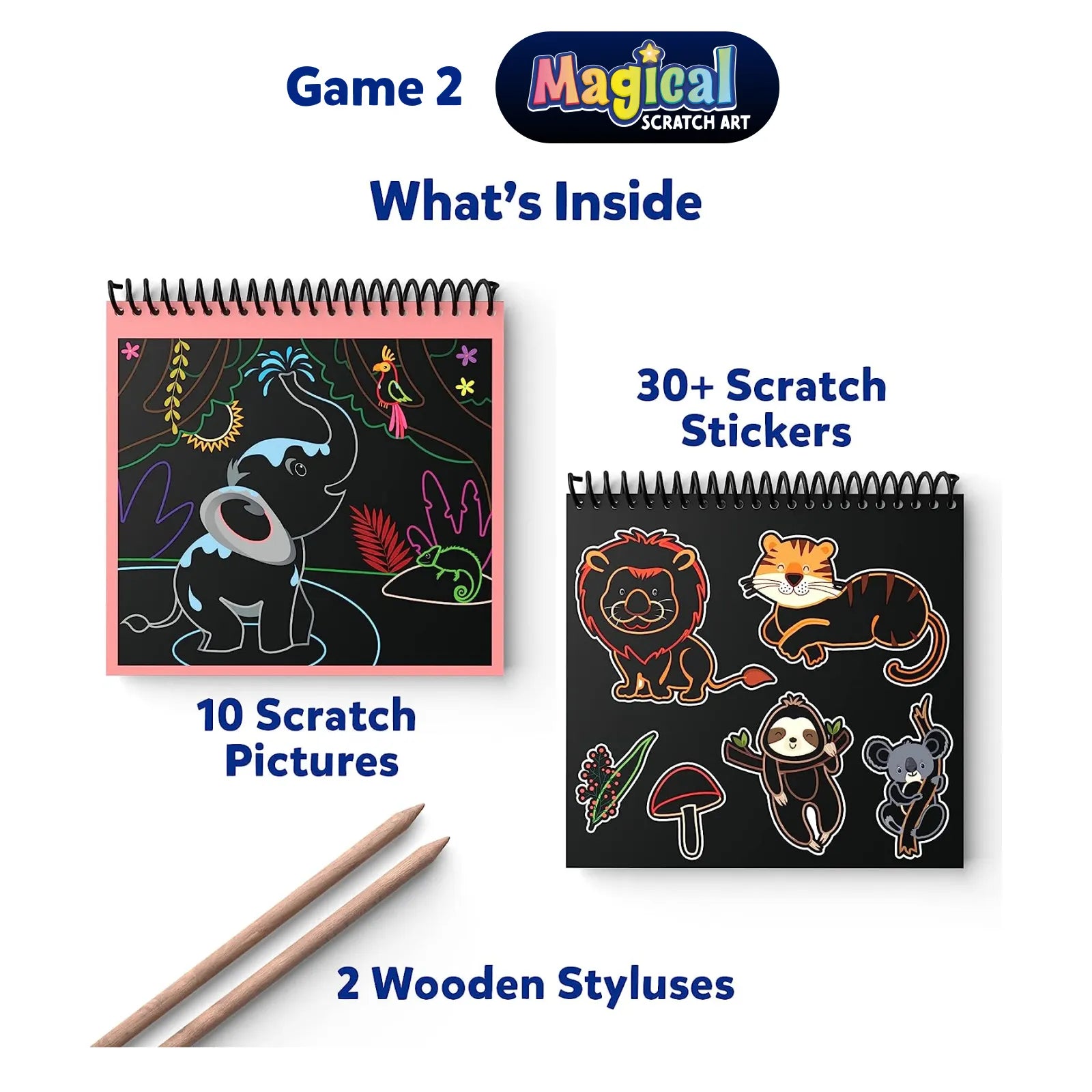 Introducing the fun, durable, and child-friendly Magical Scratch Art Book: Amazing Animals, where kids go on an adventure into the animal world. The perfect way to turn this delightful journey into a mode of creative expression for children aged 3 to 8, it’s an art book game like no other! With 10 Scratch Pictures, 2 Wooden Styluses, and 30+ Scratch Stickers, it’s the ideal play tool for your little one at home or on the go.